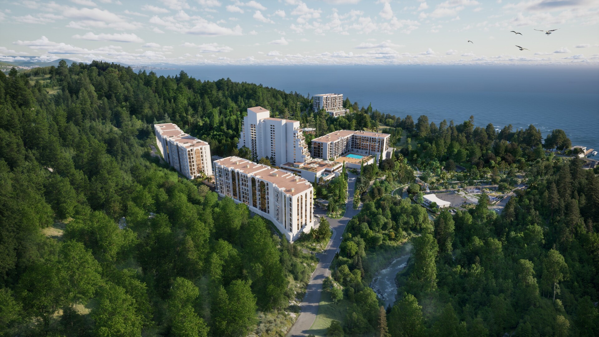 Комплекс располагается на 10 га закрытой, особо охраняемой территории, 7 гектаров которой занимает реликтовый дендропарк с редкими субтропическими растениями. Панорамные виды, зрелая зелень и продуманная ландшафтная архитектура формируют ощущение приватного курорта